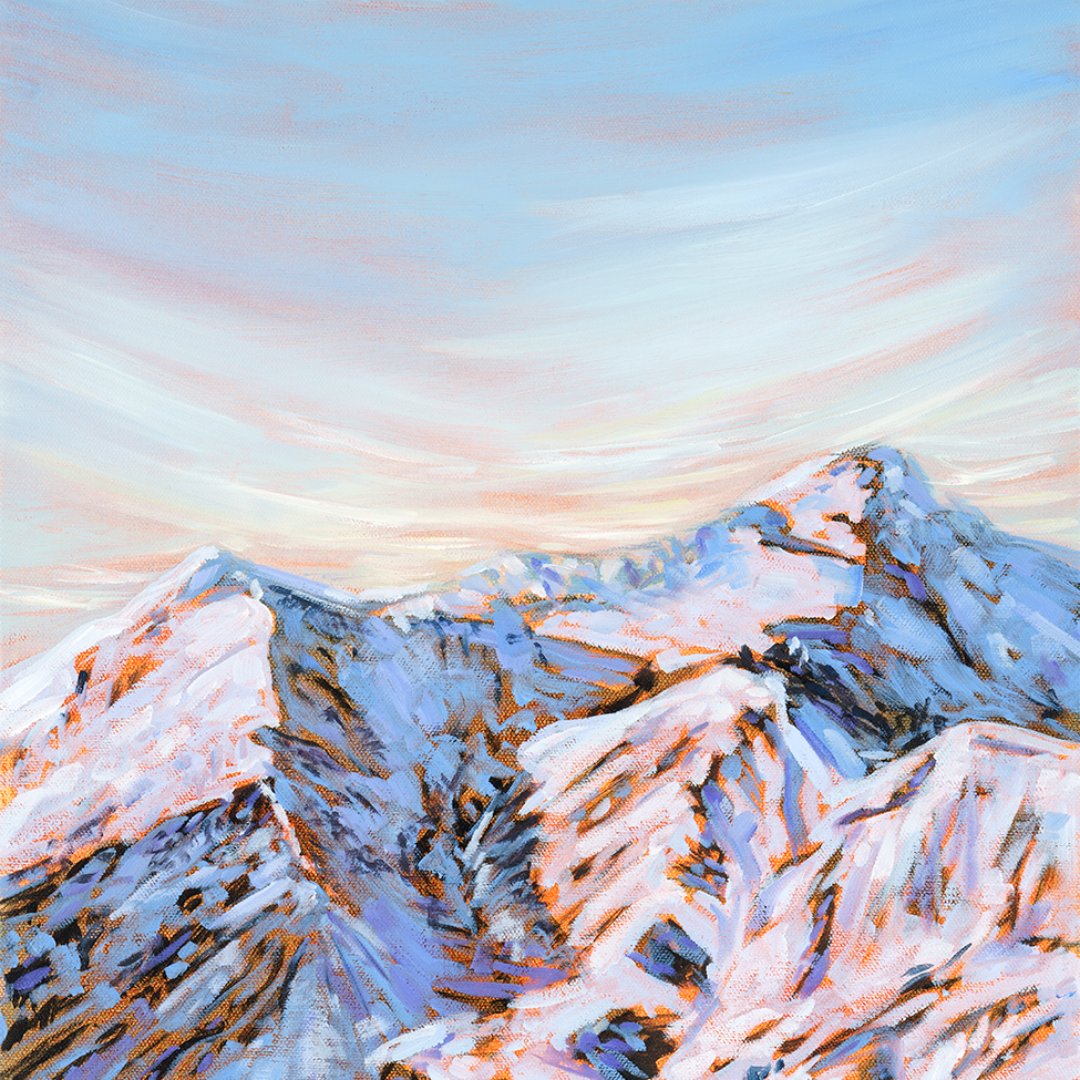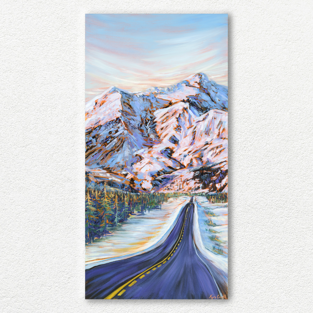 My painting process always begins with an orange underpainting. Here I decided to leave much of the base layer exposed to simulate the stunning glow of the mountains in the morning light. As for the road, black is boring. I’m obsessed with the way the indigo reflections bring the movement of the moment to life. It’s like you’re in the passenger seat.